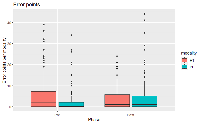 The results show that in the Pre-training phase (on the first day of the module) there are fewer error points in PE than HT. Previous research has shown that MT had a levelling effect on more novel translators (Guerberof Arenas 2014); in this case, it appears that PE helps novel students to have fewer errors. However, the errors increase in the Post-training phase and this is particularly noticeable in the PE modality, in the HT modality translators make slightly fewer errors than in the Pre-training phase. This could be explained by the fact that students were more careful in the first task than in the last task (it was the last day of the course and the assignment was not to be graded so this could have been done in a rush). However, their progression appears to be better in HT than in PE. Nevertheless there are fewer errors in PE than in HT in both phases.
