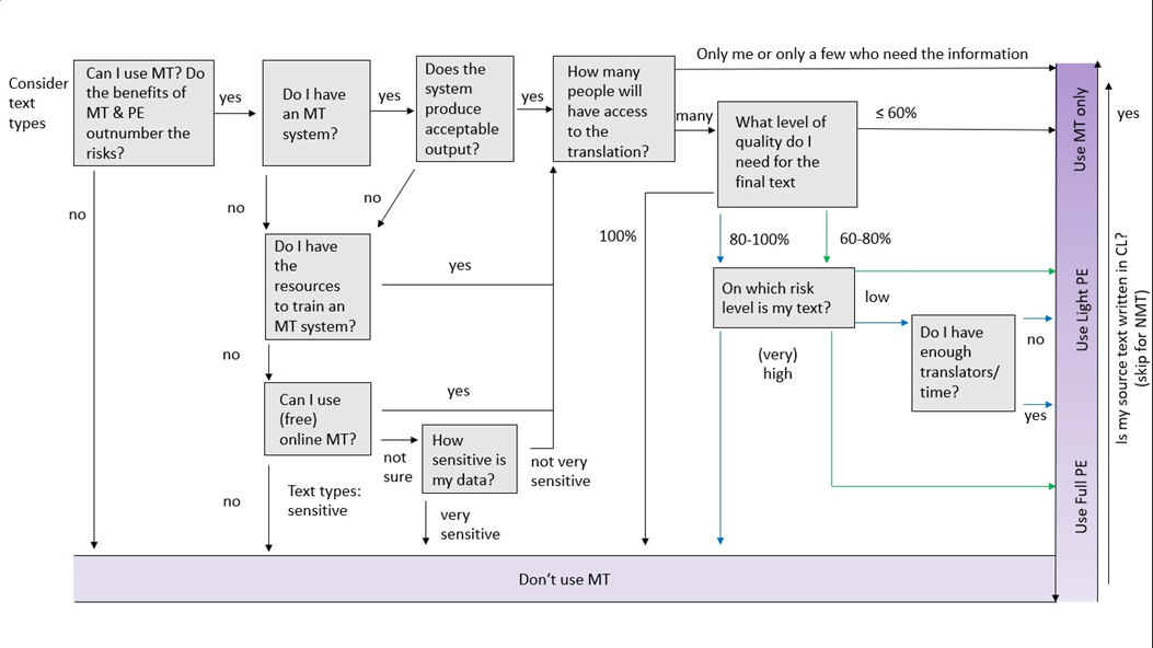 The decision tree model asks questions in the order suitable for PE projects. Depending on how project managers or the respective decision makers answer these questions, they will end up with a recommendation, i.e., “Use raw MT”, “Use Light PE”, “Use Full PE” or “Don’t use MT at all”.