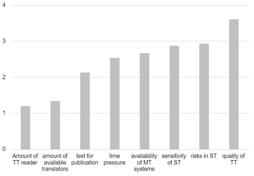 In the scoring task, the interviewees rated the importance of the following factors in their decision for or against MT in translation projects on a Likert scale, with 0 being “not important” and 4 being “very important”: