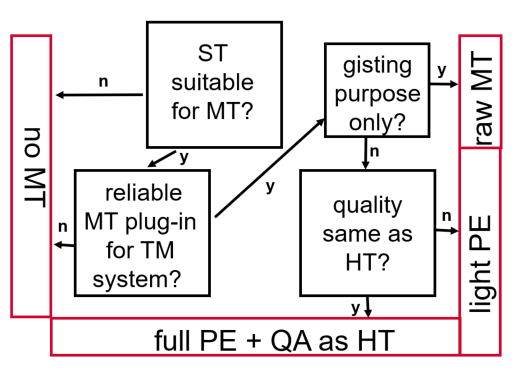 Based on empirical evidence proving the efficiency of PE compared to translation from scratch (e.g., Nitze and Oster 2016) and considerations involving risk analysis and risk management (Canfora and Ottmann 2018), we published a decision tree for PE jobs (Nitzke et al. 2019) that aimed to guide stakeholders in charge of deciding whether a project is suitable for PE and, if so, what kind of quality assurance might lead to fit-for-purpose translations (see Figure 1). The criteria in our model included the availability of suitable MT systems, the availability of resources (suitable translators/post-editors/language engineers, suitable tools, time, budget), data confidentiality, the number of recipients of the translation, as well as the text type and the desired quality of the target text. This model is in line with Way, stating that the “degree of human involvement required – or warranted – in a particular translation scenario will depend on the purpose, value and shelf-life of the content” (Way 2013: 2). Another criterion was the specific risks when using MT due to MT errors, liability risks or risks for information security (Canfora and Ottmann 2020).