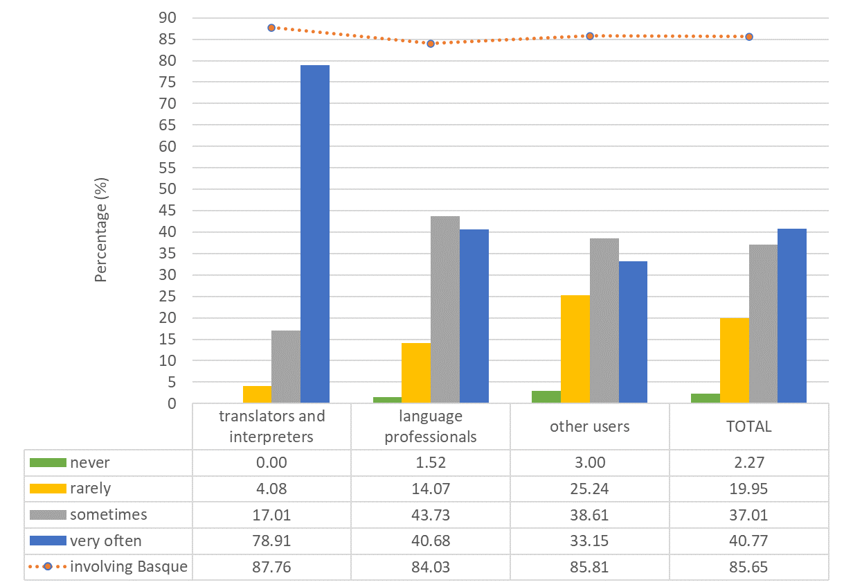 As expected, we observe that translators and interpreters handle Basque translation in the workplace very often (81.80%). Only 4.5% never do so. What is interesting is that respondents who do not belong to this industry also report involvement in translation from/into Basque in the workplace. Language professionals and other users claim to engage in translation involving Basque very often (42.72% and 40.72%, respectively). The percentage increases to around 70% if we also consider those admitting to engaging in this activity sometimes.