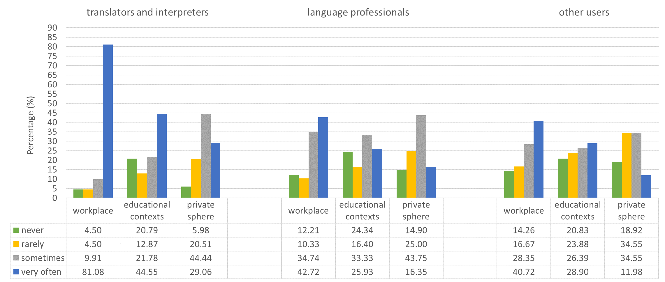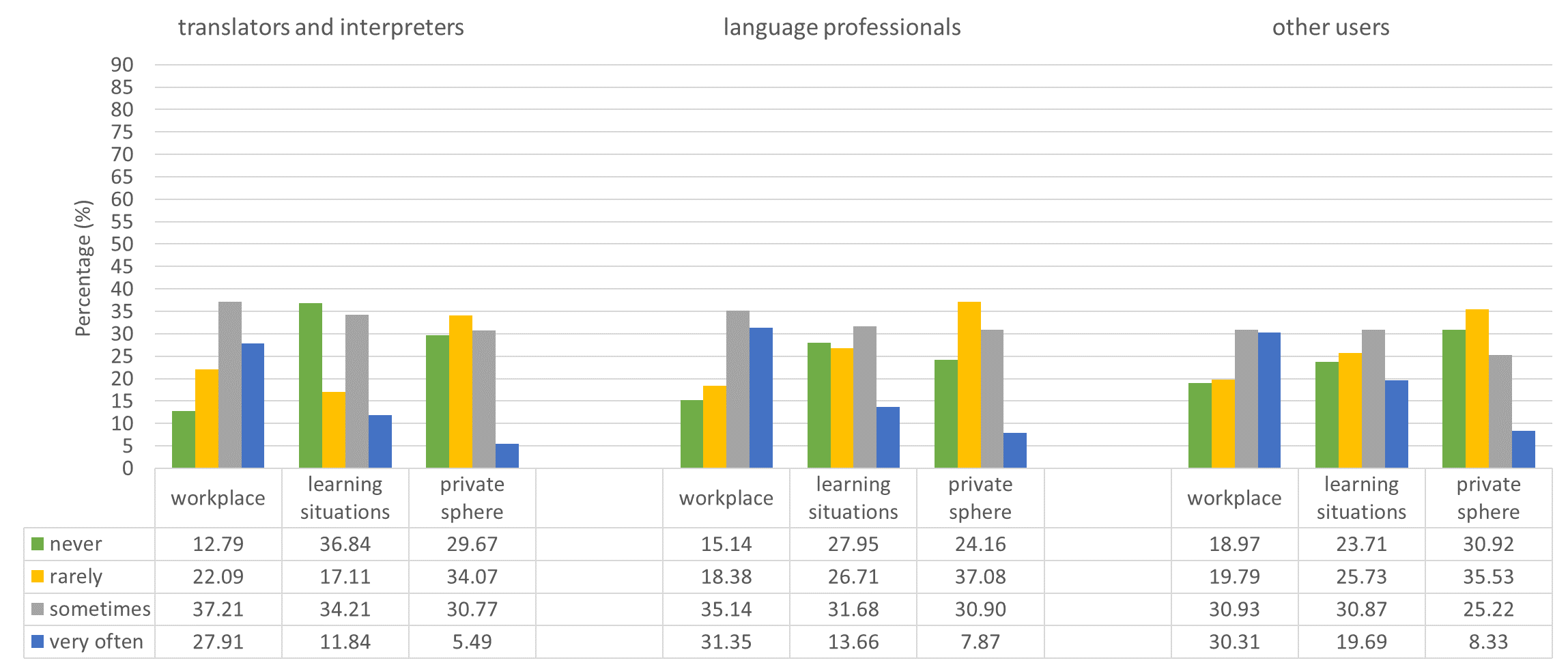 Regarding the context of use, as with unaided translation, the workplace is once again where MT for the minority language is most frequently used (see Figure 6). Still, we can see that it is also quite regularly used by other users for homework-related tasks. If we compare this with the totality of translation needs observed earlier, we could say that about 30% is very often addressed using MT in the workplace, which is a considerable proportion.