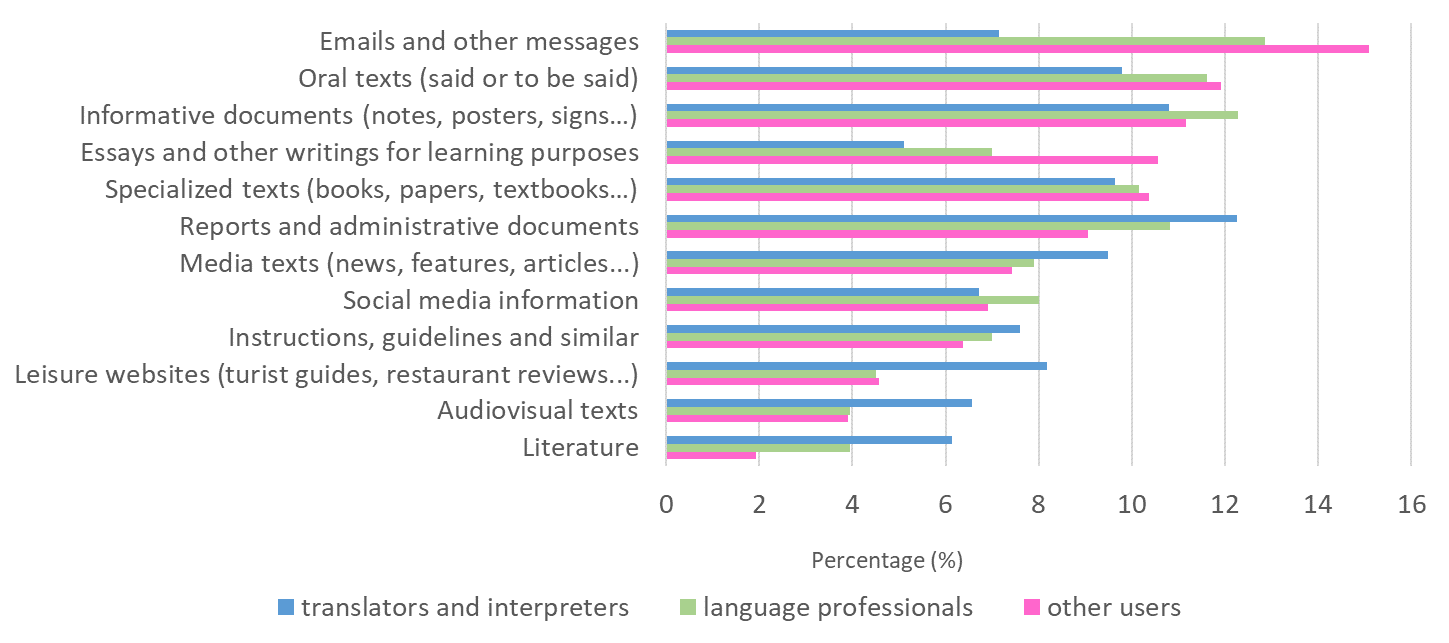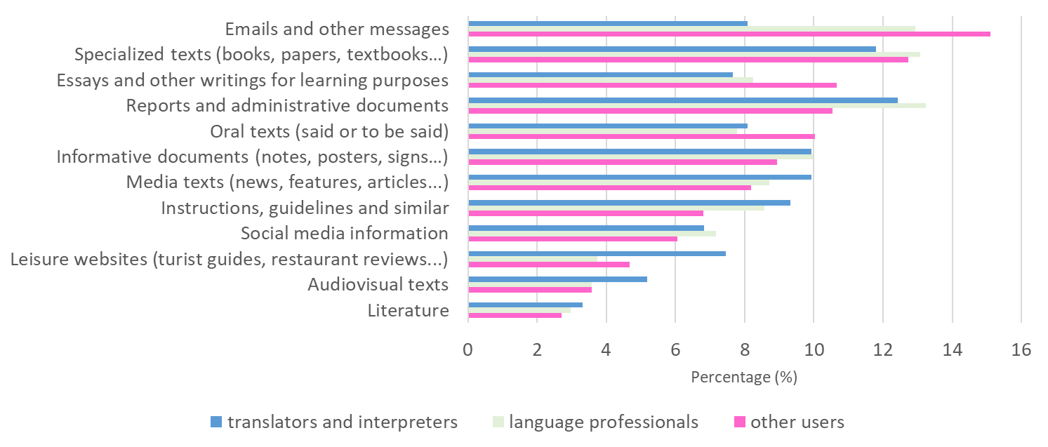 A final question in this block refers to the types of texts respondents translate. We asked participants to select the text genres that applied to them from a list. Results indicate that there are differences between user profiles (see Figure 3). The most salient difference is the higher proportion with which other users translate emails and other messages and essays and other writings for learning purposes compared to professional translators and interpreters. We might have expected that other users would engage in translation for leisure and entertainment more often than in other genres, but this does not emerge from their answers. This seems to be in line with the prominence of using translation in the workplace. Professional translators address literature and audiovisual texts more frequently than other groups and mostly work on reports and administrative texts. For language professionals, messages and informative texts are key. Finally, it is interesting to see the relevance of oral texts across groups.