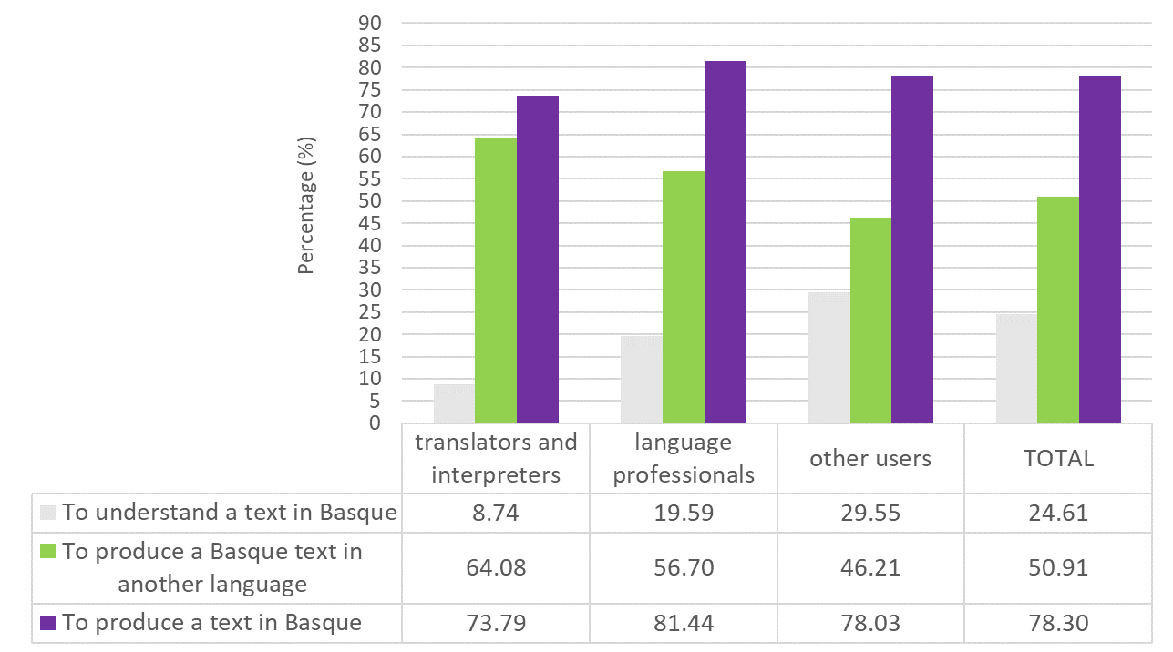 Educational contexts also see a rather significant percentage of respondents requiring translation from/into Basque very often (25.93% and 28.90% of language professionals and other users, respectively), while the figures decrease in the private sphere (16.35% and 11.98%, respectively). A possible reason for this is that the use of Basque might be compulsory in many educational settings and therefore learners must deal with Basque texts, whereas engagement in personal interactions in Basque is freer. It is interesting to see that the higher the level of specialization in languages, the higher the involvement in Basque translation is outside the workplace.