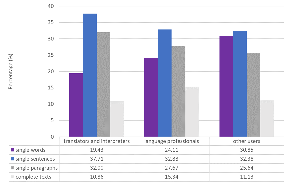We deemed it relevant to find out the units of language the speakers provide the engines to obtain the translations, as quality might depend on it. Current neural MT engines consider context to a very limited degree when constructing the best equivalent. We should also bear in mind that most are trained to translate sentences, which means that they will struggle with smaller units and that they will not consider references or agreements beyond the sentence structure. Results show that MT is often used as a dictionary, with 27.91% of the total respondents feeding the engines single words (see Figure 8 for the figures per specialization group). Other users approach MT in this manner the most, compared to translators and interpreters, who are the least likely to take this approach. This might reflect their greater awareness of the technology’s internal workings. The language unit that is most frequently provided to the engines is the sentence across all groups, while complete texts are provided by the lowest proportion of speakers.