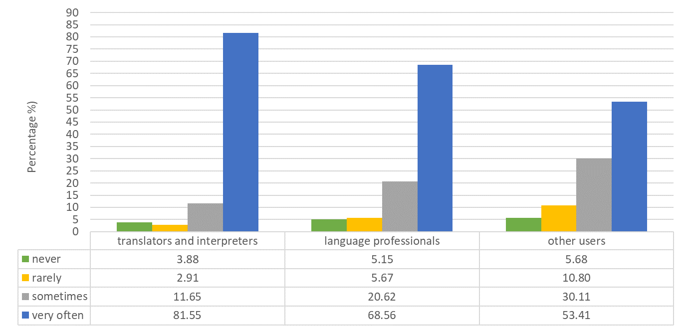 In reference to MT use, 26.25% of all respondents admit to using the technology very often, the percentage being very similar across groups (see Figure 4). The proportion of respondents who use it sometimes increases up to 42-43% in the case of language professionals and other users, and it is slightly lower at 35.37% for translators and interpreters. Only 7.61% of the total respondents report never availing of MT, again with no differences across groups. This seems to indicate that the adoption of the technology is widespread. Interestingly, 72.18% of all respondents acknowledge using MT for Basque too, with hardly any difference across groups. Therefore, we see that despite the engines for this language lagging in terms of quality, their use is spreading.