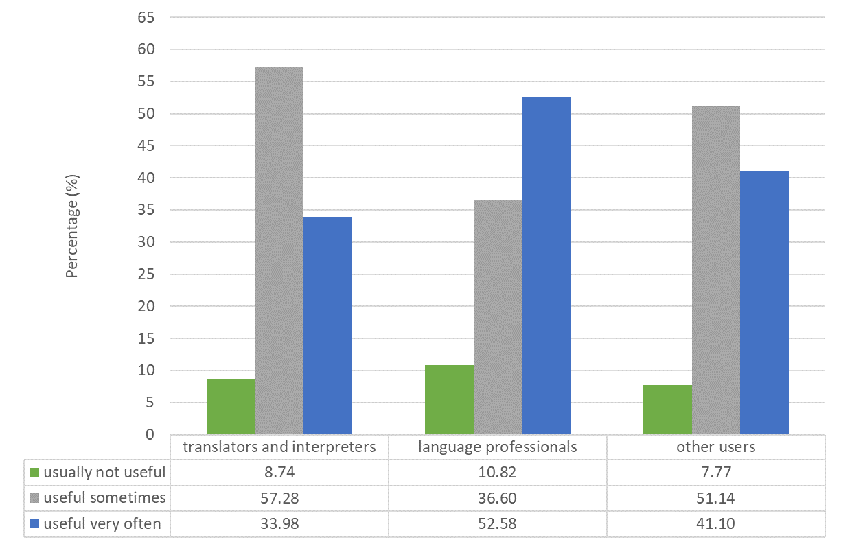 The survey’s results have so far revealed that a large proportion of respondents use MT for Basque. Let us investigate their opinion regarding usefulness (see Figure 10). Most respondents consider the technology useful, either sometimes or very often. We could claim that, in all, 91.39% of the total respondents have a positive view of MT. Language professionals seem to be the ones with the highest level of satisfaction, whereas, expectedly, translators and interpreters are more demanding.