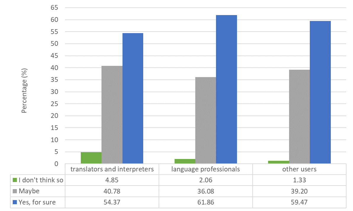 The seemingly positive attitude towards MT for Basque is further confirmed by the responses about the expected MT use in the future (see Figure 11). The great majority of respondents believe that they will use automated translation more often. More than half claim that they are sure about that claim. Among the total respondents, fewer than 5% doubt that their use of MT will increase. The most reluctant seem to be translators and interpreters (4.85%) but only 1.33% of other users share this belief. This is a clear sign that the technology is here to stay and therefore it is essential that we take measures to ensure that it is part of a sustainable revitalization process.