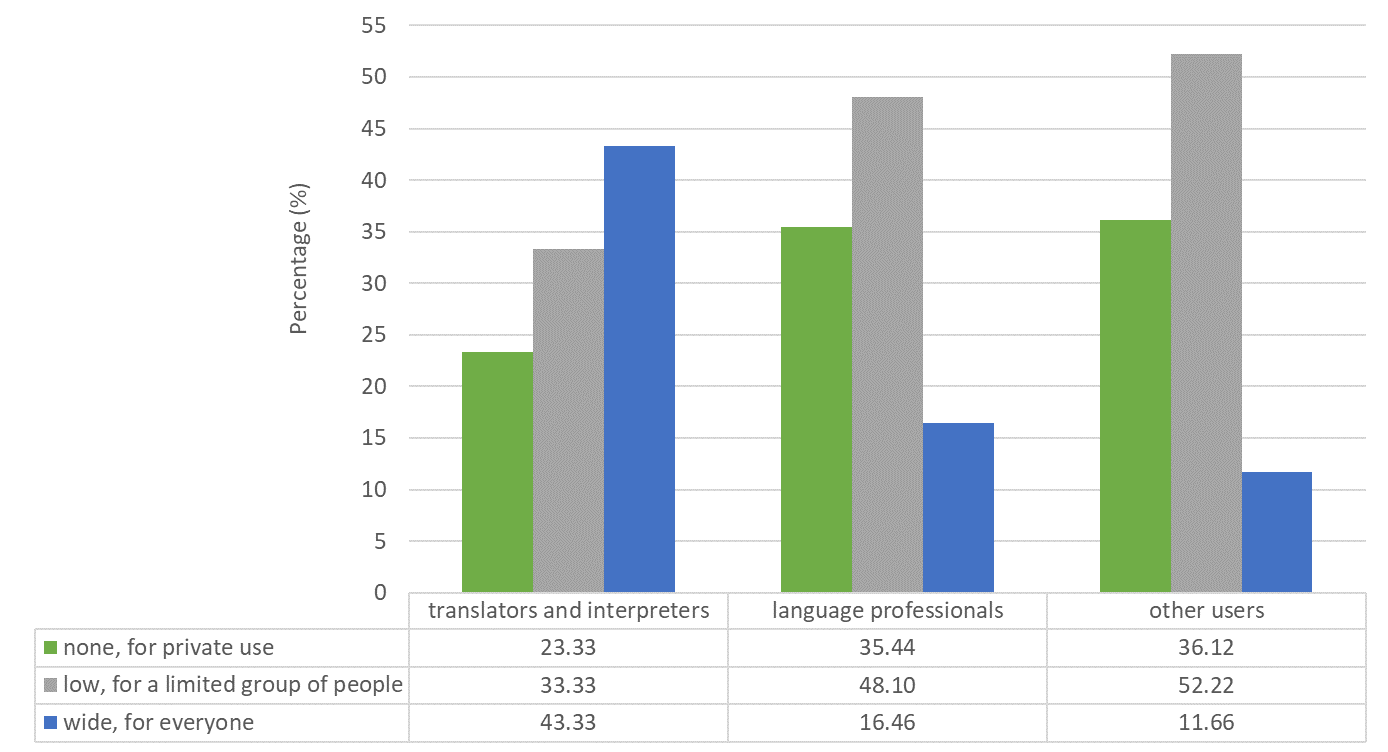 A final point we deem interesting to discuss in this block is the breadth of dissemination the texts produced with MT have. This is a first indication of the impact the language the MT texts present could have in the development of the target language. According to the data, the texts with a higher level of dissemination are those produced by translators and interpreters, which we expect to be best trained to deal with MT output (see Figure 12). However, we must not overlook the fact that around 50% of respondents in the language professionals and other user groups also affirm that their texts get some exposure. Additionally, for these two groups, 16.46% and 11.66% of respondents claim that the texts are available to a large audience.