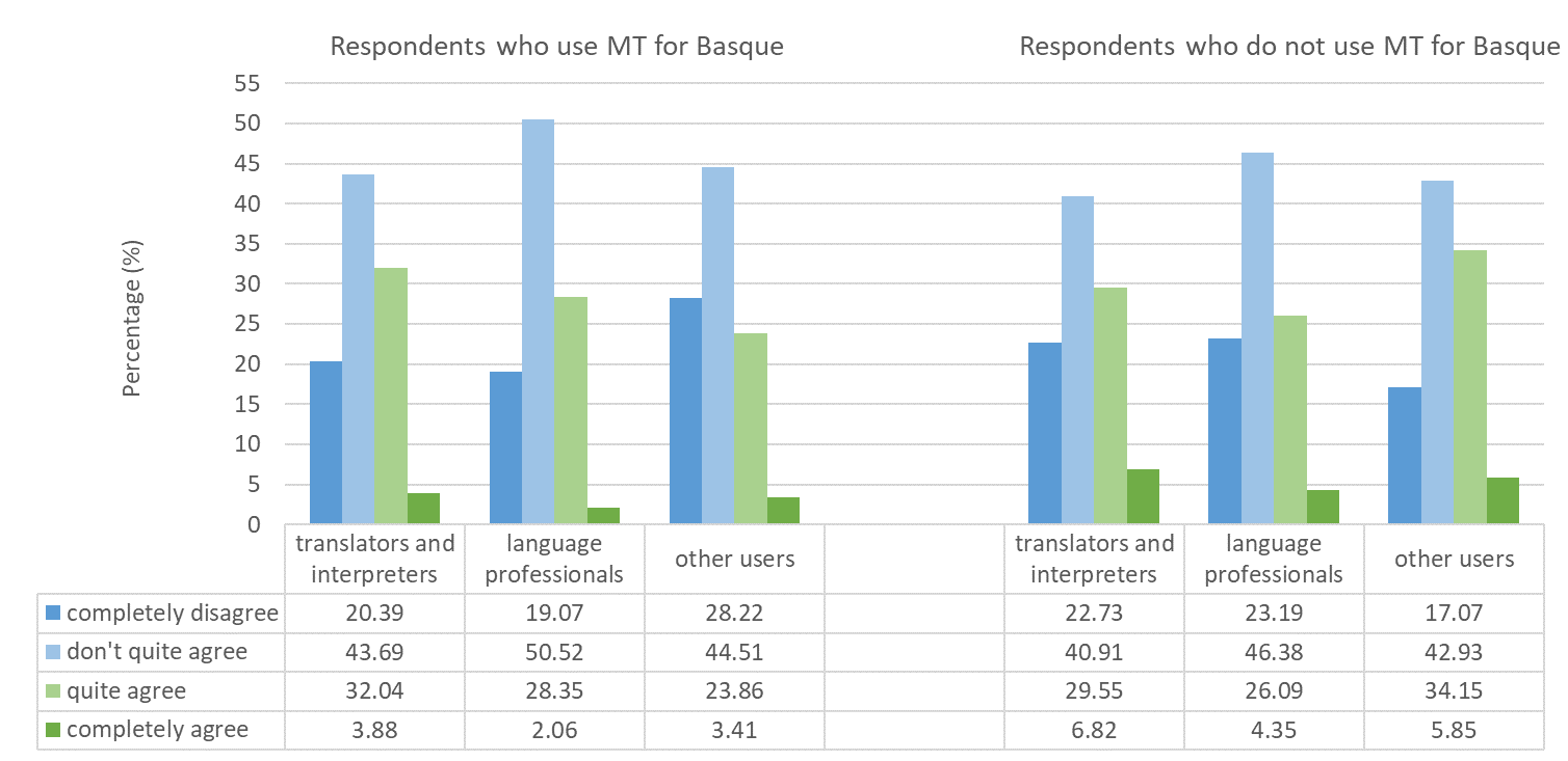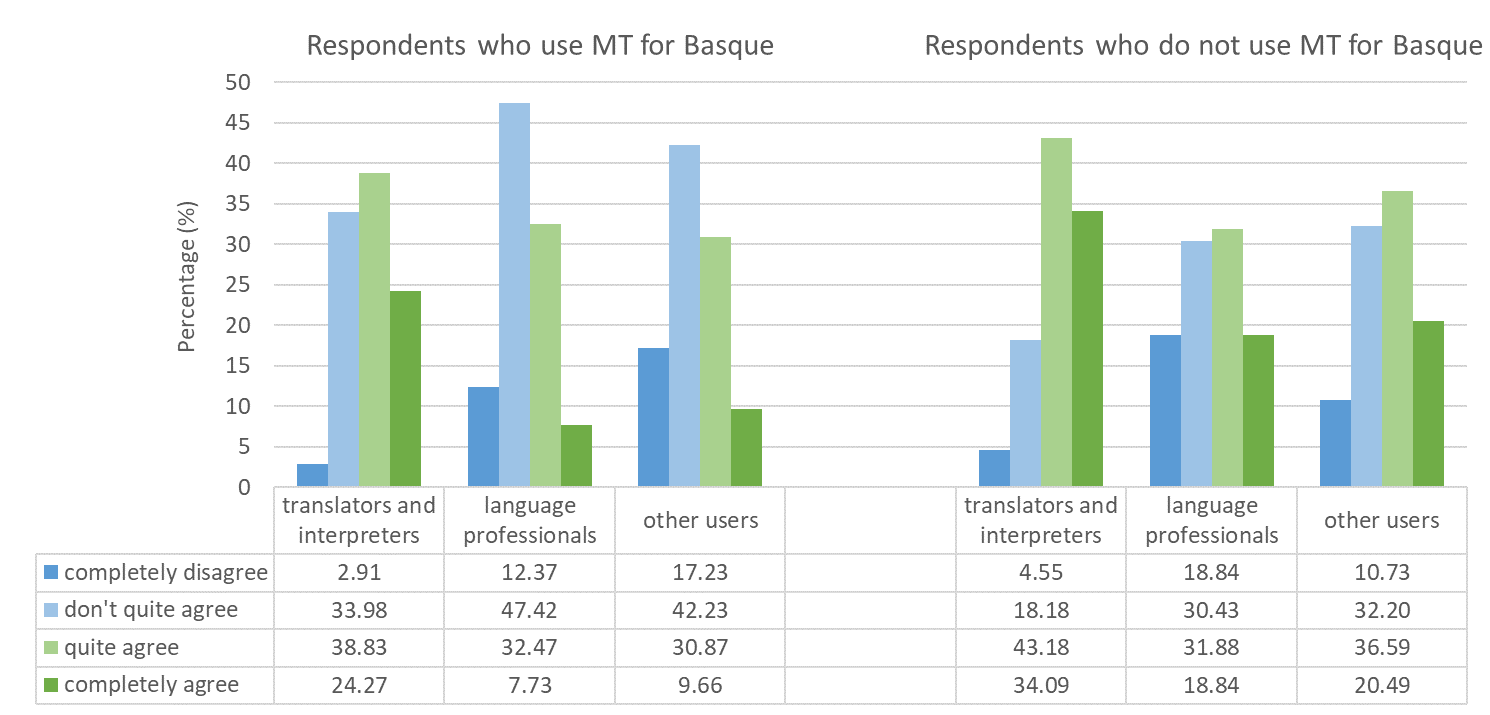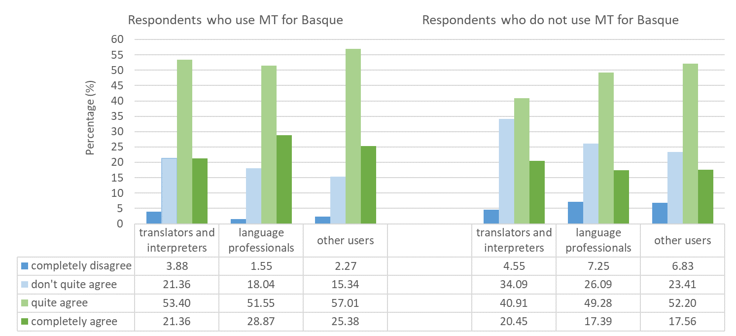 Respondents were asked to state to what extent they agreed to three statements. The first reads as follows: “Seeing that MT quality is increasingly improving; we will write less in Basque every time. Instead, we will tend to write in a major language and have those texts translated automatically into Basque.”