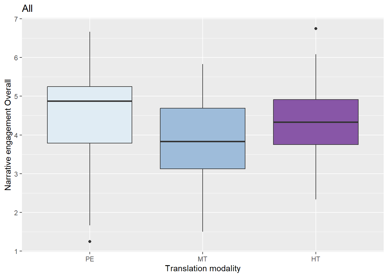 Figure 1 shows that the narrative engagement overall is highest for PE, followed by HT and lastly by MT, i.e. viewers report higher engagement when watching the telenovela with PE subtitles. These results are similar to the pilot experiment in Prolific.
