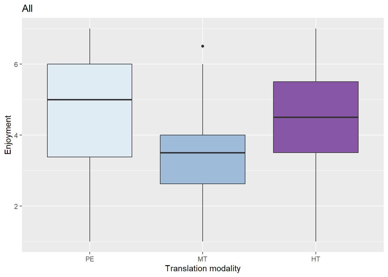 Figure 2 shows that differences between conditions are more pronounced than in narrative engagement. Therefore, and as before, we look at the variable Enjoyment according to the translation condition using the Kruskal-Wallis test. Statistically significant differences were found between conditions (H(2) = 10.03, p < .01) with a mean rank score of 69.48 for PE, 63.88 for HT and 45.84 for MT. Post-hoc comparisons show statistically significant differences between PE and MT (Z =3.15; p = .00) and between MT and HT (Z = -2.48; p = .02).