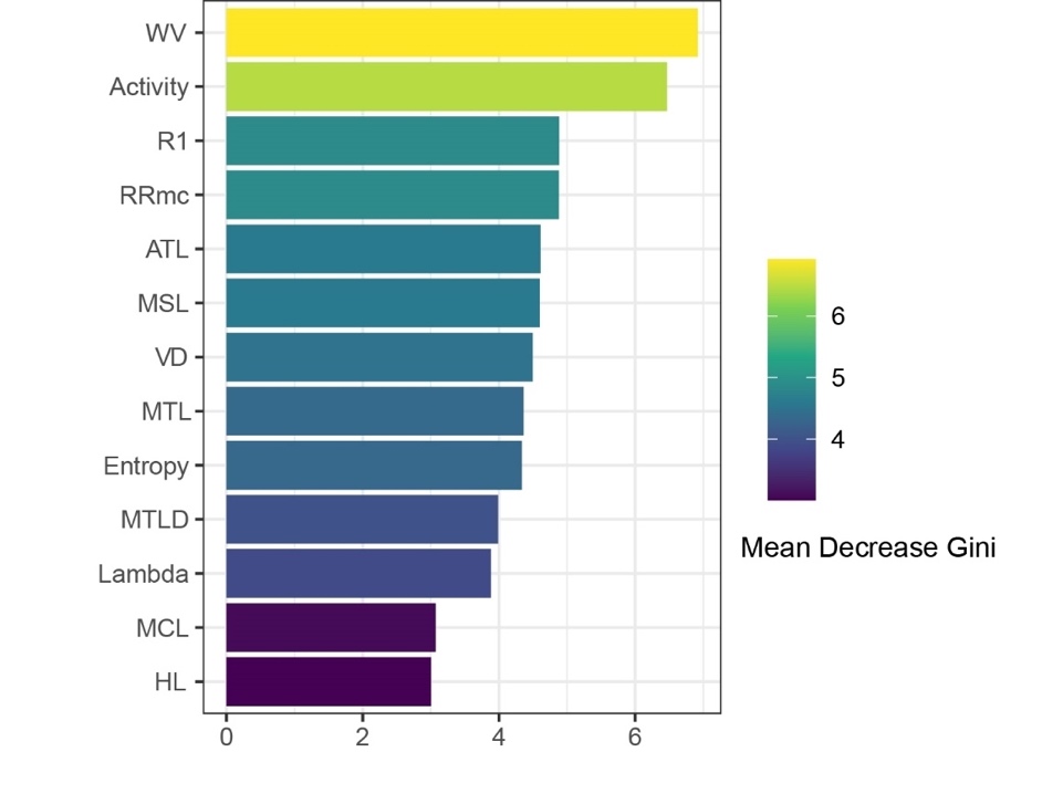 Table 3 provides a detailed breakdown of the accuracy decrease for each index in both non-translated and translated texts, along with the Mean Decrease Accuracy (MDA) and Mean Decrease Gini (MDG) scores. MDA represents the average reduction in model accuracy when a particular index is removed. A high value indicates that the feature is critical for the model’s predictive performance. This measure helps identify features that have the strongest impact on the model’s accuracy. MDG gauges the importance of each feature based on the Gini impurity criterion. In Random Forest models, each split in a tree contributes to reducing the Gini impurity, a measure of how often a randomly chosen element from the dataset would be incorrectly classified. A higher score for a feature suggests that it effectively separates classes at decision points. In this study, WV and Activity demonstrate the highest MDG (6.922 and 6.468, respectively), highlighting their strong role in differentiating translated from non-translated texts based on linguistic features. While MDA and MDG provide complementary insights into variable importance, we selected the MDG as the primary criterion for identifying important indices, owing to its effectiveness in quantifying how well each feature contributes to distinguishing between two categories of texts.