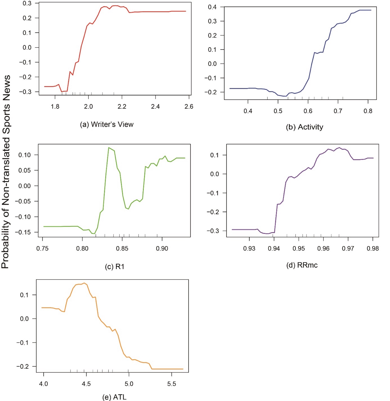 WV and Activity exhibit particularly pronounced differences between translated and non-translated sports news. A deviation in WV signals varying levels of writers’ control over lexical distribution. The prominence of Activity as a discriminative feature suggests distinct stylistic preferences for action or description. This finding aligns with observations from interpreting studies. For example, Jia and Liang (2020) reported significant variation in Activity across interpreting types. Similarly, prior studies have used WV to capture stylistic variation across genres or proficiency levels (Pan et al., 2015; Chen & Xu, 2019). Collectively, the strong importance of WV and Activity provides new evidence within specialised translation contexts that translation leaves a measurable stylistic imprint on the text.