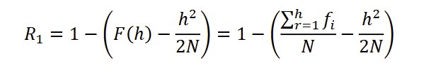 R1 is a measure of vocabulary richness, designed to estimate the proportion of content words in a text. It is based on the concept of the H-point, a boundary point on a word frequency list where a word’s frequency equals its rank Kubát et al., 2014). The H-point originates from scientometrics (Hirsch, 2005) and was introduced into text analysis by Popescu (2007). In a rank-frequency distribution of words (where words are ordered from most to least frequent), the H-point represents the position where frequency and rank intersect, capturing a balance between very frequent and less frequent words. Once the h-point is identified, R1 is calculated to estimate the proportion of content words beyond this boundary. Technically, R1 is calculated as: