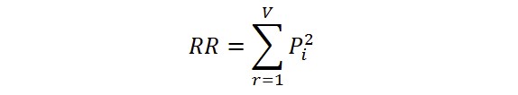 where Pi are the individual probabilities. If estimated by means of relative frequencies, Pi = fi/N, where fi are the absolute frequencies and N is number of tokens. Relative Repeat Rate (RRmc) was proposed by McIntosh (1967), yielding: