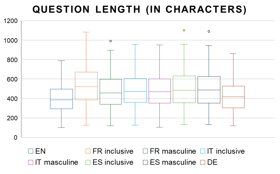 In addition to the overall word length of the entire document, the length of each test question across languages was compared as well. As can be seen in Figure 1, translations were longer (in characters) than the English source text. Of the different languages, German was closest in length to English. Differences between inclusive and masculine versions within languages were minimal, with the exception of French, where the inclusive variant was longer.