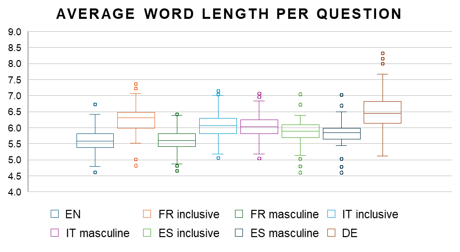 As reading research showed how average word length has an impact on reading rate (Kuperman et al., 2024), the average word length across the different conditions was also compared (Figure 2). While German seemed closest to English with regards to question length (Figure 1), the average word length (Figure 2) was much higher. French again seemed to be the language with the greatest differences between the inclusive and masculine variants.