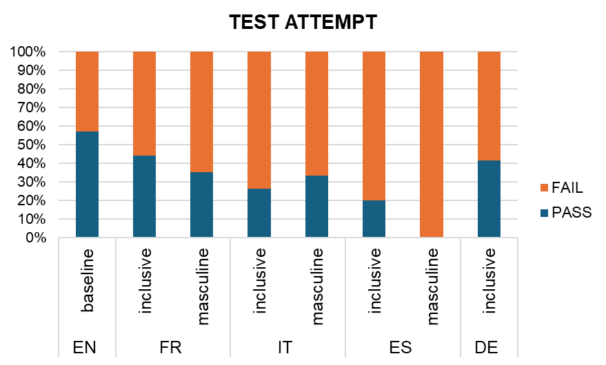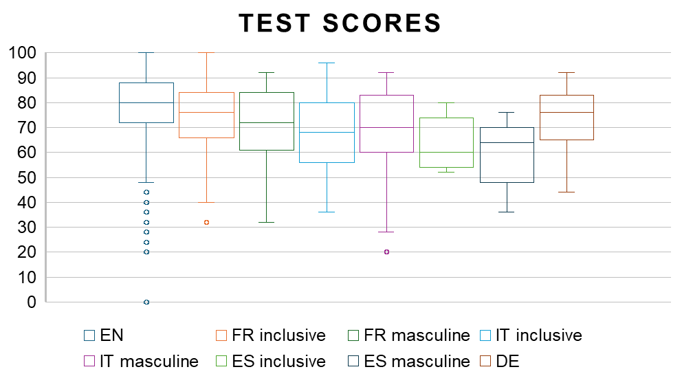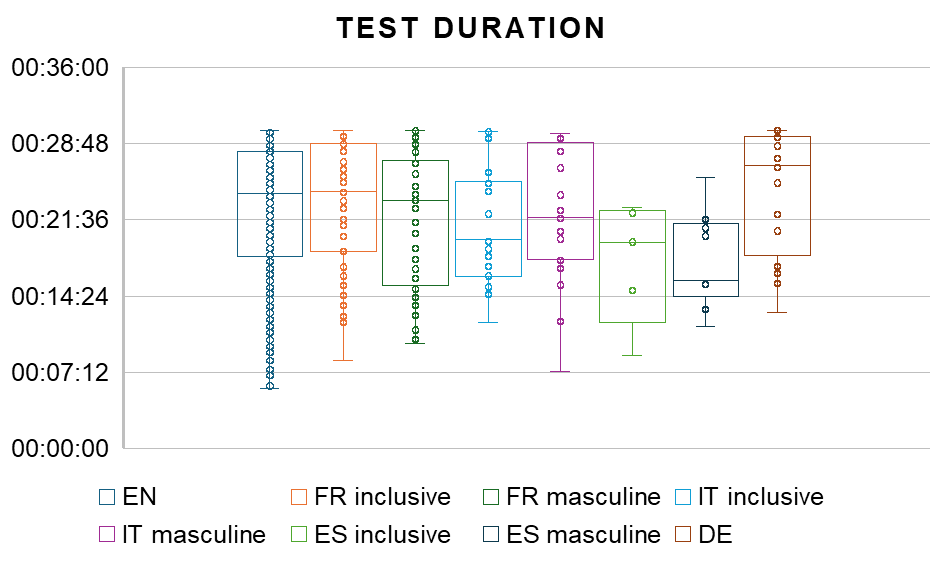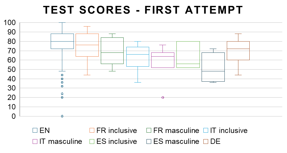 To study performance, first a global analysis was performed on the entire dataset, in the form of two-sample t-tests in Microsoft Excel to check if there were significant differences between English and translations for test duration and final score. An additional analysis was conducted to check for differences between English and specific languages, and for differences between conditions (inclusive versus masculine) for French, Italian, and Spanish. Since the same test taker could take a test multiple times, an analysis was made of overall success rate (how many test takers managed to pass the test eventually) and the average number of tests needed to pass. To reduce the impact of individual test takers on results, the analysis was repeated on a subset of the data, only taking into account each test taker’s first attempt.