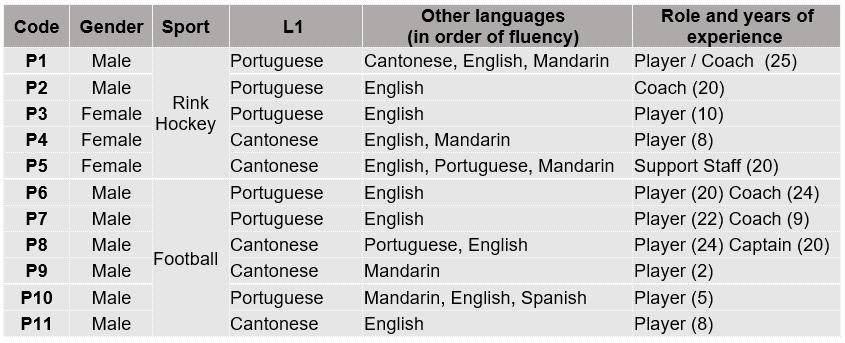 Additionally, we carried out 11 semi-structured interviews (45-70 min each), selecting participants through purposeful sampling (Patton, 2002) to capture diversity in linguistic background, team role (player, captain, coach) and experience. Interviews took place outside practice times. All sessions were audio-recorded, and because the researchers are fluent in Portuguese, English, and Chinese, each interview was carried out in the participant’s first language: one in Chinese and the remainder in Portuguese. Recordings were transcribed verbatim: we generated an automatic draft and then manually checked all transcripts against the audio. Selected segments originally written in languages other than English were manually translated into English by the authors. Thereafter, all files were anonymised and participants identified only by neutral codes (see Table 1). Interviewees were reminded of their right to withdraw at any time without consequence.