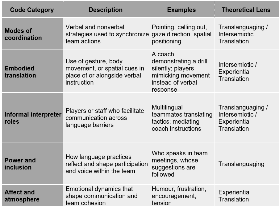 Coding proceeded in two passes. In Pass 1 (inductive/open), we generated data-driven codes such as micro-cues (stick-taps, claps, hand signals), gaze locks and pointing, proxemics (huddles, line shape, box defence contraction), spoken tokens (e.g., linha alta, costas, meu; faai dī, nī douh; “man on,” “easy”), set-piece routines (corner set-ups, face-off patterns), breakdown/repair episodes (misread runs, delayed presses followed by re-alignment), and material scaffolds (magnetic board use, cone layouts). In Pass 2 (theory-guided), we grouped and refined these under sensitising concepts: (i) translanguaging –cross-language utterances and relays (coach→captain→backs), hybrid calls (e.g., “Caralho, play easy lō”), emergent team lexicon; (ii) intersemiotic translation – speech→gesture or diagram→drill mappings (e.g., double clap + point standing in for ‘short then switch’; board arrows enacted as skating lines); and (iii) experiential translation – affective and sensory markers tied to coordination (tone escalation, celebratory stick-tap chains, touch for reassurance after fouls, tempo hush during referee signals). Initial codes thus came from the data; the TIE lens served to organise and interpret them rather than to pre-impose categories. For each coded sequence we also logged initiator, recipients and outcome (alignment or misalignment). These codes were then organised into thematic categories that captured both functional and affective dimensions of meaning-making in multilingual sports contexts. A full list of codes with brief examples appears in Table 2.
