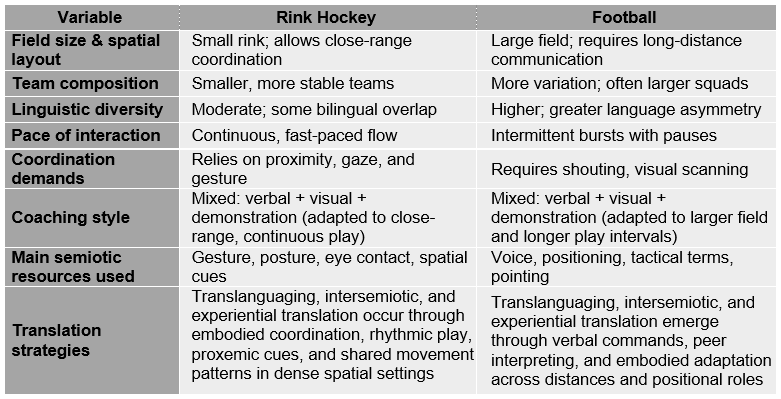 A comparative matrix was used to assess communication strategies across rink hockey and football, incorporating variables such as field size and spatial distribution, team composition, linguistic diversity, pace and type of interaction, coordination demands, coaching styles, and the semiotic resources employed. This comparative approach allowed for a nuanced understanding of how TIE practices were shaped by each sport’s specific spatial and communicative affordances (Creswell, 2013). Notably, football often required long-range spoken instructions and positional adaptation, whereas rink hockey relied more heavily on close-range coordination, proxemics, and gestural interaction. Table 3 presents a breakdown of these contrasts, highlighting the distinct semiotic ecologies and translation strategies that emerged in each sport.