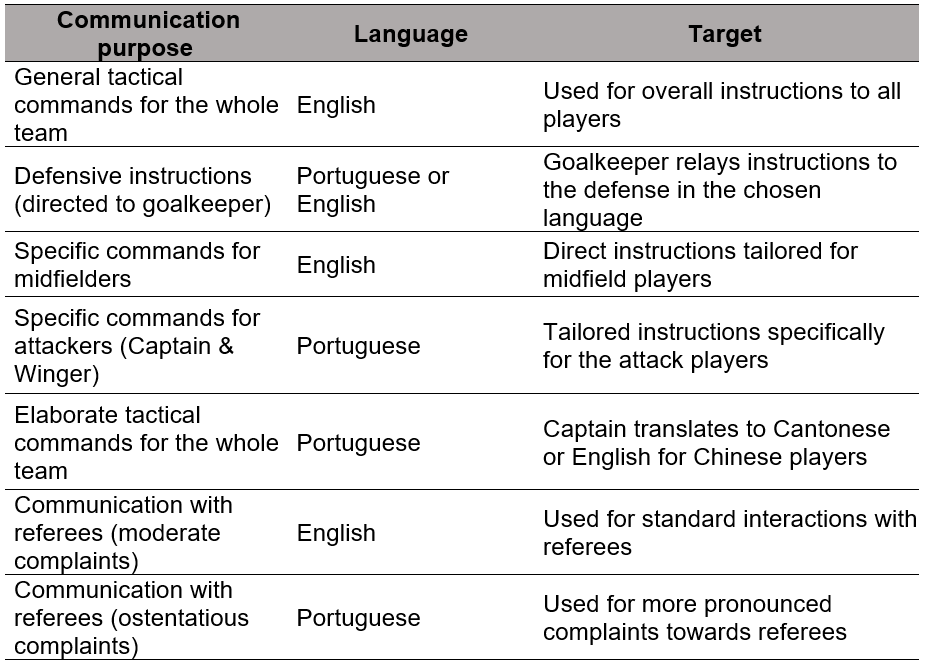 In our training observations, we noticed that Chinese is the least used language on the team, with no collective tactical instructions observed in Cantonese or Mandarin. However, specific terms appear in interactions – especially between the Portuguese-speaking goalkeeper and Chinese defenders. As an example, we highlight these words that are commonly used in the team: in Cantonese, faai dī, faai dī (快啲 faster), díu (屌 fuck off); in Mandarin, lái lái (来来 to come), wǒ lái (我来 it's mine/leave it to me), wǒ / wǒ de (我/我的 I/mine).