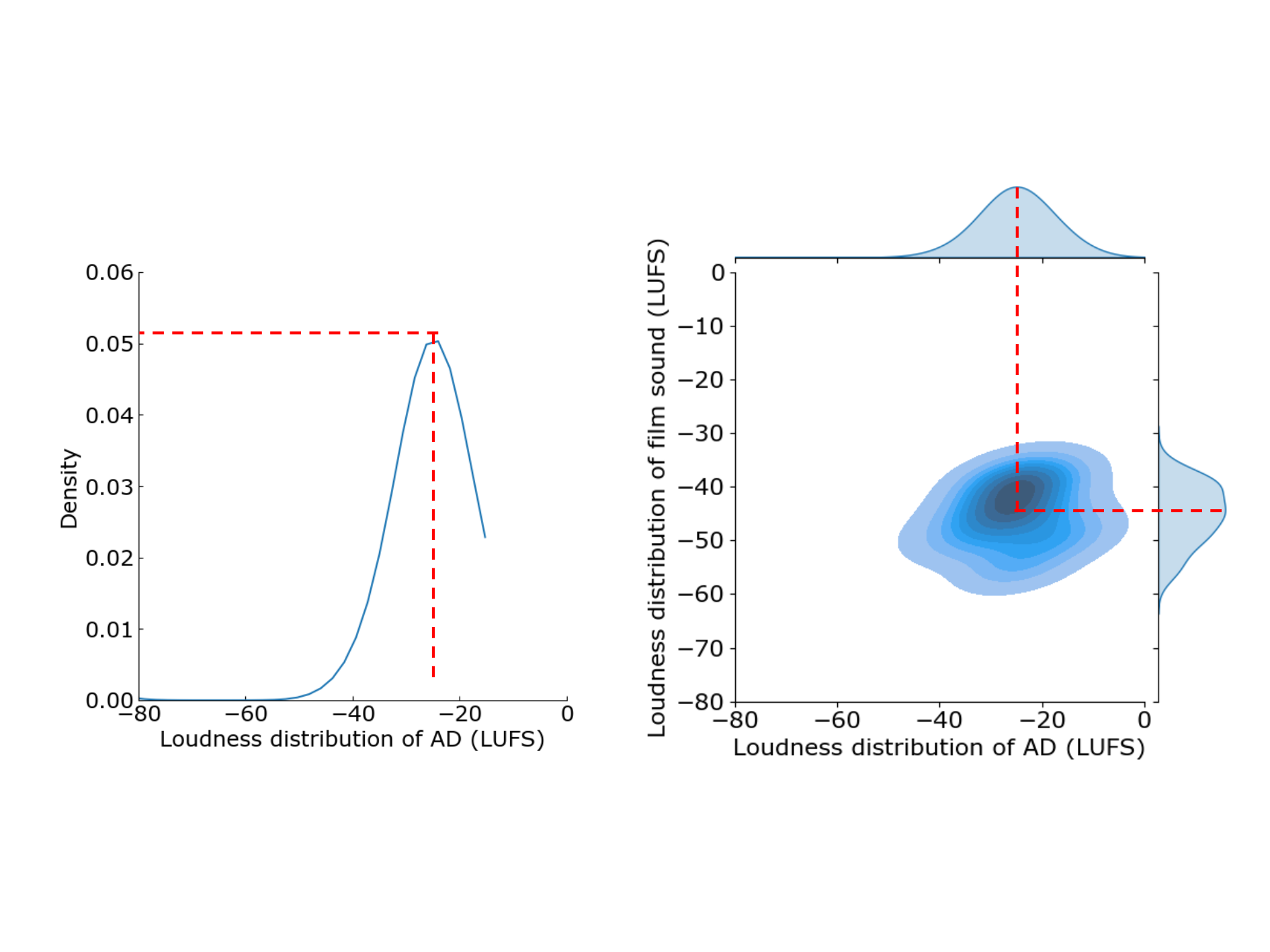 Figure 2. Maximum loudness coordinates of the AD and film sound values calculated by kernel density estimation. Loudness distribution of a single AD (left); loudness coordinates for a pair of the AD and film sound (right).