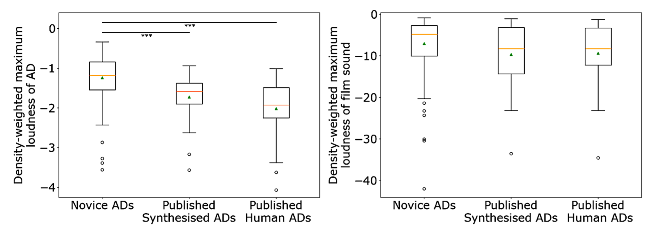 Figure 4 plots the mean density-weighted maximum loudness values of the ADs and film sound during the AD presentation for the novice ADs, published synthesised ADs, and published human ADs. Statistical analysis was performed using the Mann–Whitney U test and the Holm–Bonferroni method. The results showed no significant difference in the film sound. However, regarding the ADs, the values of the novice ADs were significantly higher than those of both the published human and synthesised ADs at the 0.1% level. However, there was no significant difference in these values between the published human ADs and published synthesised ADs. The Mann–Whitney U test provided an effect size r of 0.28 between the novice ADs and the published synthesised ADs, and 0.38 between the novice ADs and the published human ADs.