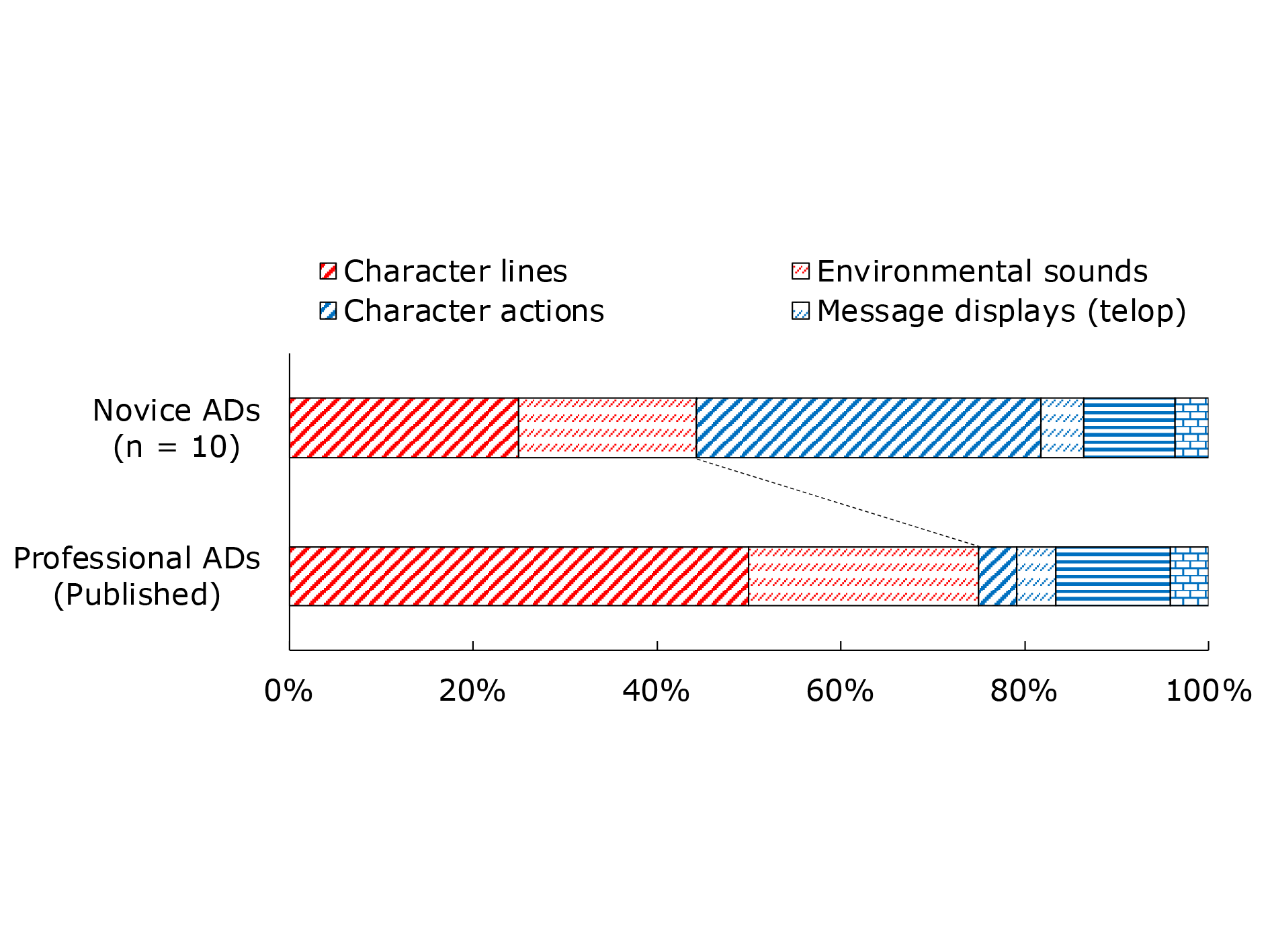 We explored techniques acquired by professional developers to create ADs that would be easily audible, even at reduced AD volumes. The sound and the manner in which an AD is matched in a film strongly affect the ease of hearing an AD and understanding the corresponding content. If AD insertion is performed without considering the relationship between the AD and the film sound and flow, and only the timing of the displayed images to be explained by the AD is considered, the overlap with the sound of the film will probably increase. To determine the extent to which the novice describers were able to account for the relationship between the AD and film sound, we asked each describer to mention the information in the film that aligned with the insertion position of each AD. Figure 6 shows that most of the published ADs were triggered by auditory information such as character lines and environmental sounds, whereas a quarter (25%) of them were triggered by visual information such as character actions, message displays (telop appearances), and scene and cut changes. In contrast, more than half (55%) of the novice ADs were triggered by these visual cues. This discrepancy was supported by a comment from the professional describer who was the instructor in the novice AD production experiment, in which the novice describers often described the trigger for AD insertion as visual information rather than auditory information. The results of this study revealed that novice describers tended to be distracted by the visual information explained by the ADs and neglected to consider the sonic connection and flow between the film and the AD, which is important for people who are blind or partially blind to understand the content of a film easily and in depth.