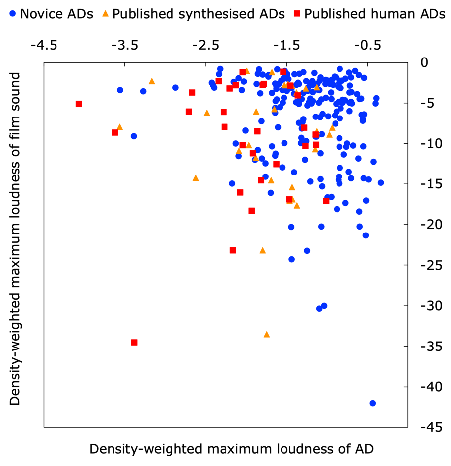 The shape of the density distribution and the magnitude of the maximum density were different for each AD and film sound. Therefore, the maximum density, considering the magnitude, was obtained by multiplying the maximum loudness obtained by the kernel density estimation from the depth of its density. Figure 3 shows the maximum loudness density coordinates obtained after density correction. There were 197, 28, and 30 samples for the novice ADs, published synthesised ADs, and published human ADs, respectively. Figure 3 shows that there was no difference in the distribution of the density-weighted maximum loudness of the film sound (shown on the vertical axis) between the novice ADs and the published synthesised ADs or between the novice ADs and the published human ADs. By contrast, the distribution of the density-weighted maximum loudness of the AD (shown on the horizontal axis) was shifted to a higher range in the novice ADs than in the published ADs.