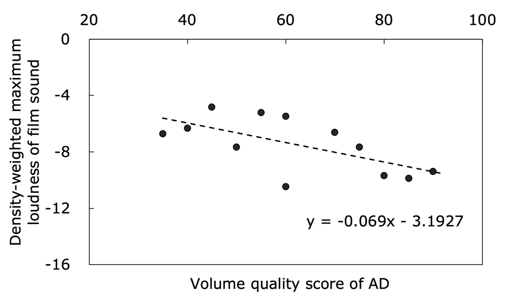 Figure 5 shows the correlation between the density-weighted maximum loudness of the film sound during the AD presentation and the AD volume quality score assessed by the film producer for all ADs, including the novice ADs and published ADs. The correlation coefficient of −0.636 revealed a significant negative correlation at the 0.5% level, with the slope and intercept of the line of best fit being −0.069 and −3.19, respectively.
