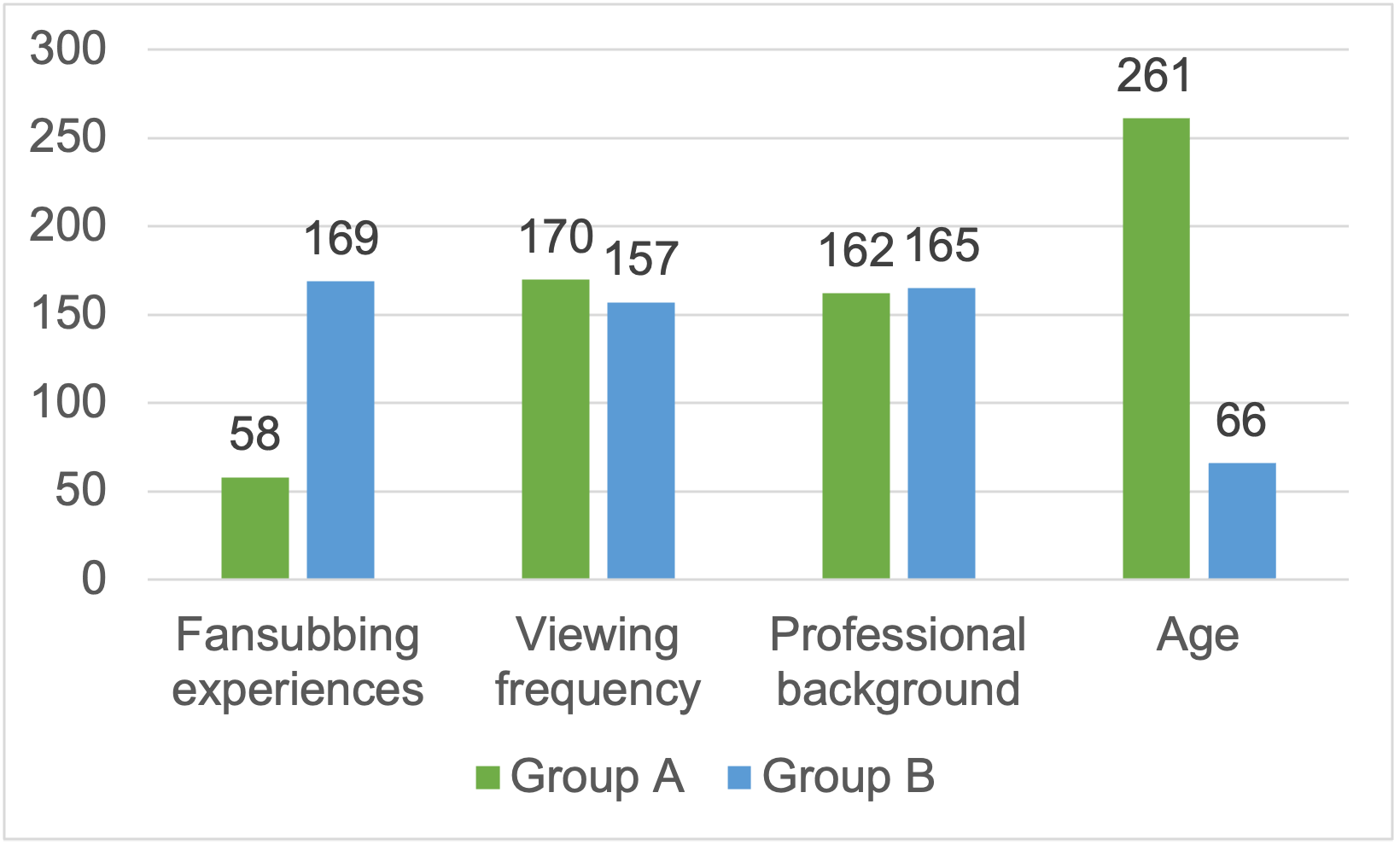 In terms of professional background, 49.5% (n = 162) are language professionals and 50.5% (n = 165) are non-language professionals. Around 80% (n = 262) of the respondents are under the age of 30, with half falling within the range of 18 to 24. Around 70% (n = 46) of the remaining respondents are between 31 and 40. This demographic data indicates that the public is generally young. The period of fansub groups’ rapid growth in China, from 2001 to date, coincided with the formative years of the majority of respondents (those under 30) or their early adulthood (those over 30). For data presentation, we classify respondents with ‘fansubbing experiences,’ ‘frequent viewers,’ ‘language professionals’ and ‘people under 30’ into Group A, while their counterparts are grouped into Group B. This categorisation allows for a more focused examination of the data.