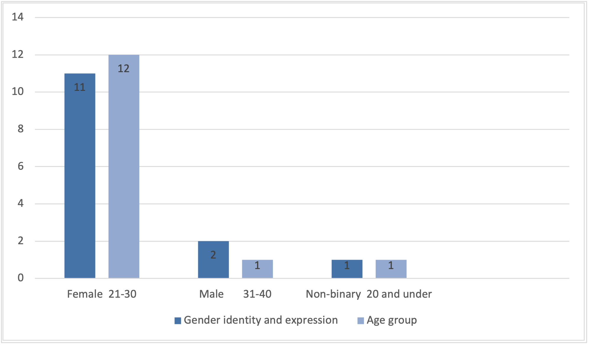 Nevertheless, individuals, particularly the younger generation, have concealed interest in and desire for sexual and gender diversity. The ‘Being LGBTI in China: A National Survey on Social Attitudes towards Sexual Orientation, Gender Identity and Gender Expression’ (United Nations Development Programme, 2016) is the largest national survey conducted in China on sexual and gender diversity issues. Although social homophobia persists in China, the survey conducted with almost 30,000 respondents, primarily born in the 1990s (77.0%), indicates that a substantial majority hold a generally open and accepting attitude towards sexual and gender diversity. The changing attitudes of young people may contribute to the increasing prevalence of audiovisual content featuring sexual and gender diversity in entertainment and artistic works in recent years. Fan-subtitling Team A primarily produces audiovisual content centred around male homosexuality. Based on Figure 1, the analysis of the gender identity and expression, and age group of the 14 samples in Team A reveals that the majority of fansubbers in the sample are young females.