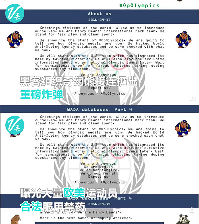 Figure 4. Screenshots from “Hackers Exposed Doping Use among European and American Athletes. This Classmate Please Manage Your Facial Expressions.” English translation of the Chinese subtitles: Hacker team ‘Fancy Bears’ dropped a bombshell by revealing that a large number of European and America had been taking banned substances.