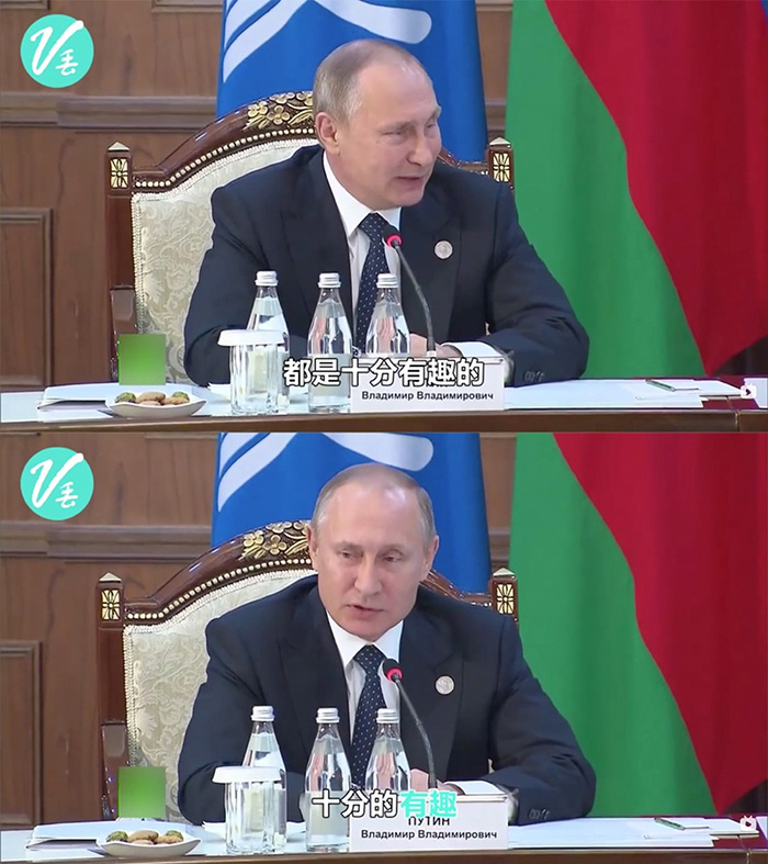 This source video illustrates that RT has already become responsive to the entertainment-oriented context on YouTube by introducing personalised tabloid-like news to its YouTube audience. However, The Observer makes this video funnier and does not treat Putin as respectfully as RT does. Playing down the respective and authoritative aspects of the source video benefits The Observer commercially by entertaining its Bilibili audiences. Although Putin’s authority is downplayed to some extent, his image portrayed in the translated videos does not, in principle, contradict the Kremlin’s preferred image of him, whilst at the same time reinforcing his charisma. The Observer makes the Russian president appear to be less like a formal leader who remains distant from the people, and more like an ordinary, fallible person. This translation strategy fosters an interpersonal relationship between Putin and the viewers and constructs a sense of familiarity with Putin, thereby increasing the acceptability of the Chinese and Russian narratives that Putin espouses.