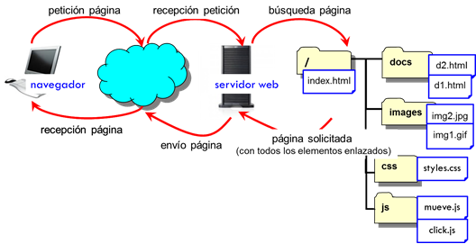 Como es conocido, toda web tradicional (estática) es un conjunto de páginas HTML entrelazadas de alguna forma entre sí y que contienen referencias a otros elementos dependientes: ficheros de imágenes, sonido, video, hojas de estilo, scripts…. Ante una petición de una página por parte de un usuario, el servidor que aloja la web se limitará a buscarla y, si la encuentra, a remitirla al ordenador peticionario con el resto de elementos referenciados. Una vez recibidos, el navegador del solicitante se encargará de interpretar (presentar visualmente) el código HTML (véase ilustración 1). Por tanto, existe una correspondencia entre los archivos o páginas HTML que se encuentran en el servidor y los que recibe e interpreta el cliente.