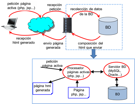 Por el contrario, podríamos definir una web dinámica como un conjunto de datos almacenados en una base de datos (BD) – gestionada por la capa de software conocida como sistema de gestión de base de datos (SGBD)1– y, por otro lado, un conjunto de programas conocidos como páginas activas (en lenguaje PHP, ASPX, JSP…) –con su correspondiente software procesador o intérprete del lenguaje– que constituyen la interfaz para que los usuarios del sitio manipulen la BD2.