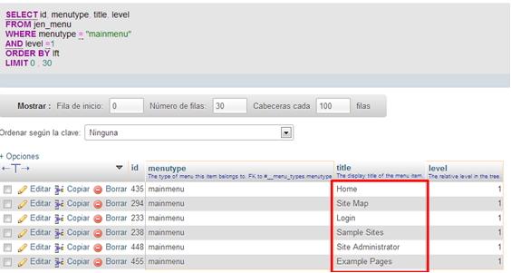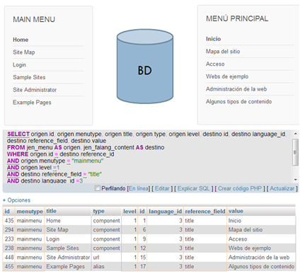 Dicha sentencia pertenece al lenguaje SQL (Structured Query Language), un lenguaje estándar (ANSI e ISO) para la manipulación de BD basadas en lo que se conoce como modelo relacional. Muchos de los SGBD actuales incorporan dicho lenguaje. Por la misma razón, muchos de los productos incorporan dichas siglas en su nombre: MySQL, PostgreSQL, SQLite, SQL Server… Naturalmente hay productos, por otro lado muy destacados, que también adoptan dicho lenguaje sin incorporar tales siglas: DB2, Oracle… La expresión SQL que se recoge en la ilustración 5 está indicando al SGBD que se quieren obtener los datos de las columnas “id”, “menutype” … (línea 1: SELECT…) de la tabla en la base de datos llamada “jen_menu” (línea 2: FROM jen_menu), pero sólo de aquellas filas que satisfagan la condición que se expresa en las líneas 3 y 4: WHERE… Además, se mostrarán, en la consulta, en el mismo orden determinado para la web (campo de anidamiento "lft").