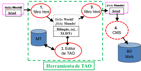 Uno de los elementos clave de las propuestas 1 y 2 es el contexto visual y funcional que ofrece al traductor trabajar sobre los objetos web en sí, ya sea en su versión resultante (HTML) o dentro del mecanismo de producción (WCMS). La primera parece promulgarse en algún artículo relacionado con el CMS Typo3 (Zielinski y Beuster 2012: 15), donde éste generaría archivos HTML marcados convenientemente para su posterior reimportación en el CMS, tras ser traducidos mediante la herramienta adecuada. La segunda, a día de hoy, posiblemente sea la de mayor complejidad técnica, al tener que integrar y sincronizar un entorno y unos mecanismos de gestión de contenido, vinculados a una base de datos, con el entorno y los mecanismos de traducción asistida por ordenador, vinculados con otras bases de datos. Mientras se trabaja en dichas vías (de manera aún marginal), cabe destacar que ambas estrategias presentan potenciales puntos débiles contrapuestos: las versiones navegables en HTML no contienen, superficialmente, todas las posibles formas de interacción dinámica con la misma, y las herramientas de TAO no siempre son capaces de procesar contextualmente las dependencias de estos archivos con otros; por el contrario, el sistema de gestión de contenidos podría dar acceso al localizador a los mecanismos significativos de producción, agrupación y definición de contenido, estructuración del mismo y dependencias existentes, a costa de cierto alejamiento, durante la traducción, de las condiciones finales de uso.