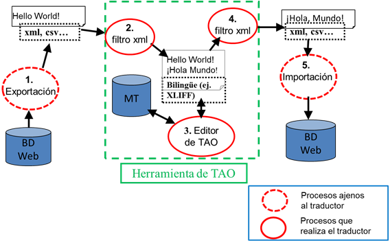 Otra fórmula posible consiste en la exportación, por parte del responsable del WCMS, de las cadenas traducibles de la base de datos a un formato de texto, que puede ser CSV (valores separados por comas), ya más en desuso, o, actualmente, alguna variedad de XML (siendo XLIFF el estándar para el intercambio de objetos e información de localización14). El traductor recibe el contenido traducible en alguno de estos formatos, y los filtros de las herramientas de traducción o localización asistida por ordenador (predeterminados, adaptados o creados por el usuario) extraerán los campos adecuados (en el caso de CSV) o los elementos o atributos traducibles (en el caso de XML). Finalmente, el traductor devuelve al cliente el archivo en el mismo formato, quien se ocupará de realizar la importación mediante las consultas y actualizaciones que haya previsto para la base de datos.