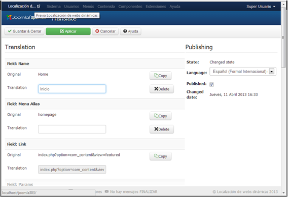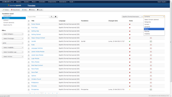 En la ilustración 8 veíamos, al final del método anterior, un ejemplo visual de traducción, con un CMS como Joomla! (con la extensión FaLang), de un elemento de contenido o artículo que aparece en la portada de nuestra web. Tras ingresar en la web con el nombre de usuario que le permita realizar las modificaciones oportunas, el traductor no tiene más que seleccionar el artículo sobre el que desea trabajar y pulsar el icono de edición que se muestra en la parte superior derecha de dicho contenido, insertar la traducción en la ventana proporcionada y guardar los cambios. Para traducir componentes más dinámicos, como los menús de navegación (por ejemplo, los de la ilustración 4), el usuario con permisos debe realizar, en estos momentos, un proceso un poco más complejo. Así, tras seleccionar la opción de traducción (“Translation”) de nuestro gestor multilingüe (accesible desde el menú “Componentes” de Joomla!), se elige el idioma de destino y el elemento que desea traducir (un menú, en nuestro caso), lo que devolverá las filas que se muestran (ilustración 10), para que se pueda marcar el texto que traducir (aquí, mediante casilla de verificación) y editarlo. En la siguiente ventana, se presenta el texto original y el espacio para insertar la traducción (ilustración 11), que tras guardarla en estado “Publicado” (Published), actualizará con estos valores las filas correspondientes de la BD y se mostrarán inmediatamente, en la siguiente solicitud de la web.