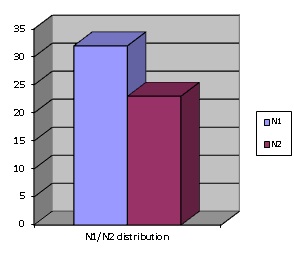 As far as the other central point of the present discussion is concerned ─ i.e. the choice between P1 and P2 within the English concept of ‘liking somebody’ ─ the results are as follows. Out of the 57 translations, ‘N1’ was opted for 32 times and ‘N2’ 23 times (cf. Figure 1). With the N1-based constructions amounting to 56.14% and N2-based constructions to 40.35%, there is a clear tendency supporting the AIM effect hypothesis.