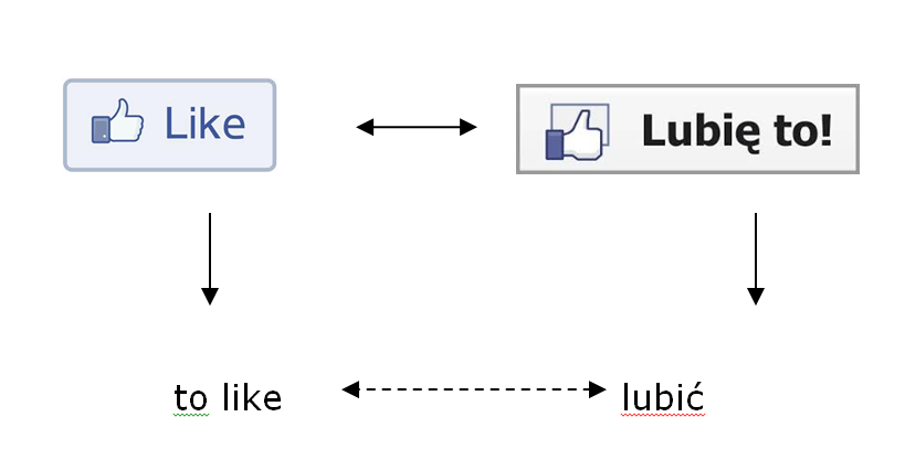 The buttons ─ in the sense of the visual representation, a platform affordance they stand for, their function and the perlocutionary effect they can bring about – enter into a relation of analogy which is carried over to the linguistic layer, thus establishing and reinforcing the cross-language match between ‘to like’ and ‘lubić’. The entrenchment of this match is visible in the noun ‘lajk’ ─ produced through reification and used in colloquial Polish expressions such as ‘mieć dużo lajków’ [to have a lot of likes].