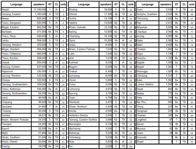 Ethnologue’s total of 120 languages includes eight languages that have no recorded speakers in Nepal, either dormant or extinct, (EGIDS 9 or 10). Of the remaining 112 languages, 17 languages have much larger speaker populations in neighbouring countries – the Indo-Aryan languages Maithili, Bhojpuri, Avadhi, Urdu, Hindi, Bengali, Marwari, Angika and Kisan, the Tibeto-Burman languages Tibetan, Mechi (Bodo), Lepcha and Byansi, the Austro-Asiatic languages Santhali, Mundari, Kharia, and the Dravidian language Kurux. If we remove these languages as potentially well served by the neighbouring countries, this leaves 95 languages that are predominantly Nepalese. Using the statistics given in the descriptions Nepal’s languages in the 17th edition of Ethnologue (Lewis, Simons and Fennig 2013), I have compiled the table shown in Table 1, arranging the languages in descending order of size.
