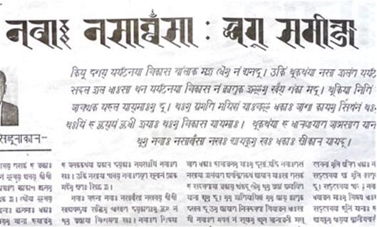 You can see Newar writing carved into stone or wood, or embossed in brass or other metals, in temples around the valley as in Figure 1. There are two distinct styles4 of writing, an ornate style with many long downward strokes called ‘Ranjana,’ and a more rounded style ‘Prachalit.’ Examples from a modern newspaper are shown in Figure 2.