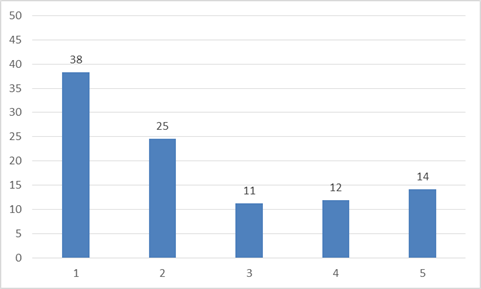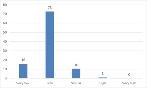 The mean is 2.36 or below the middle point; the median is 2 (“to a low degree”) and so is the mode. The data show little variation based on the respondents’ backgrounds. The mean rankings by university vary between 2.21 and 2.51, but this is not statistically significant (Chi Square, p=.249). There are also no significant differences based on gender (Chi Square, p=.433) or age (Chi Square, p=.408), and, perhaps surprisingly, the status rankings do not correlate with the respondents’ work experience (r2=.006).