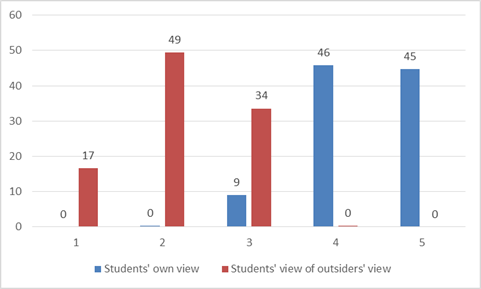 The students thus strongly believe that translating requires a “high” or “very high” degree of special skills (mean 4.35, mode/median 4). Equally strongly, they believe that outsiders fail to grasp this (mean 2.18, mode/median 2). The difference is statistically significant (Chi Square, p<.001).