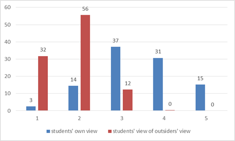 The items on whether the students regard translation as an expert function and whether they believe outsiders to do so produce virtually identical responses. In the students’ own opinion, translation is clearly an expert function (mean 4.48, mode/median 5), but they expect people outside the profession to think so only to a low degree (mean 2.25, mode/median 2). Again, the difference is statistically significant (Chi Square, p<.001).