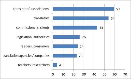 For the questionnaires distributed at Helsinki and Tampere, this item was reformulated: the respondents were asked to select those one or two agents whom they believed to have the most influence on translator status. The reformulated item produced a total of 233 ‘ticks’, or approximately 1.96 per respondent (there were 119 respondents for this rephrased item: 64 from Helsinki and 55 from Tampere). These responses in Figure 7 below show differences among agents’ perceived influence.